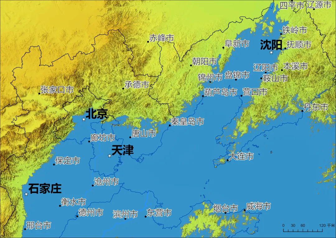 京津冀核心区:天津、廊坊、沧州、唐山等城市会被完全淹没,北京城区因平均海拔约 43 米,也会被大面积淹没,仅西部的西山、北部的军都山等山地会成为高地。渤海会向西大幅扩张,与华北平原的浅海连成一片,形成巨型内海。