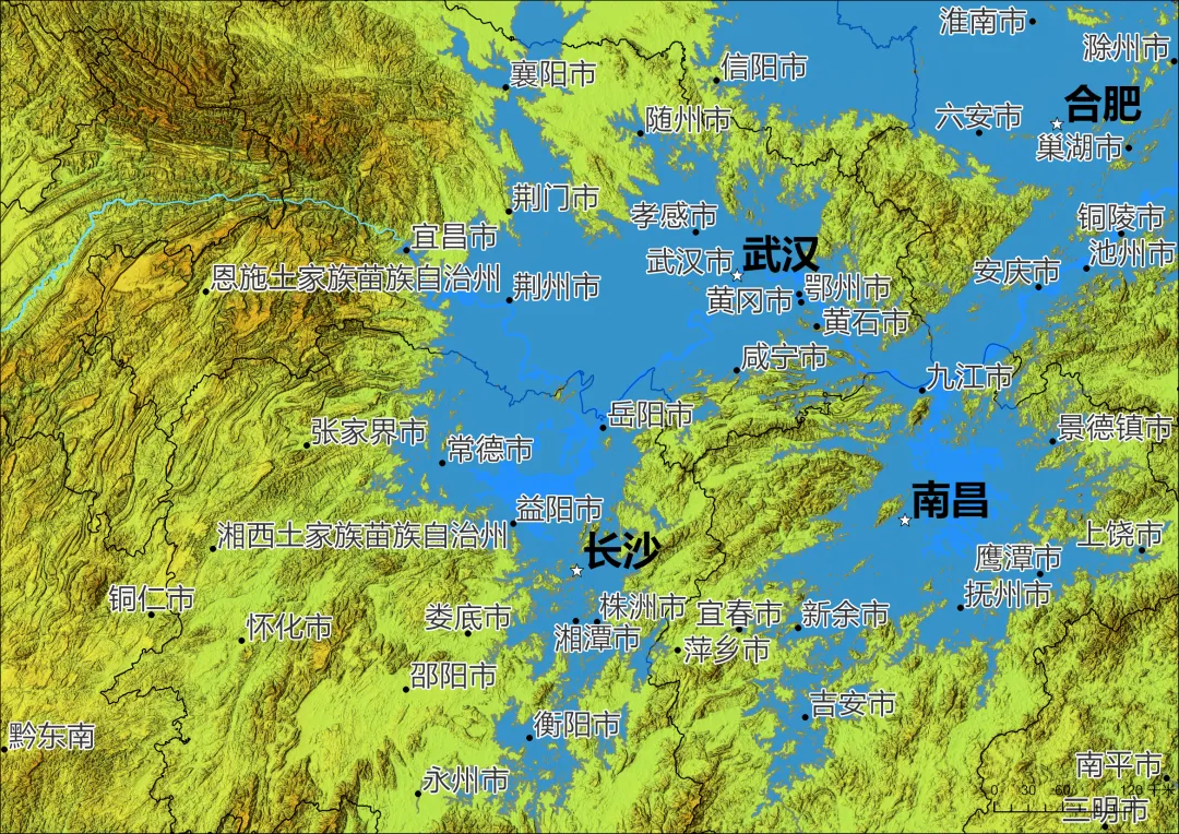 江汉平原与鄂东沿江区域:武汉、鄂州、黄石、黄冈等城市所在的江汉平原东部和长江沿岸平原会被大面积淹没,长江河谷将倒灌至武汉近郊,仅城市外围的低山丘陵会露出水面。荆州、宜昌等长江中游城市也会被部分淹没,江汉平原将成为一片广阔的浅海。