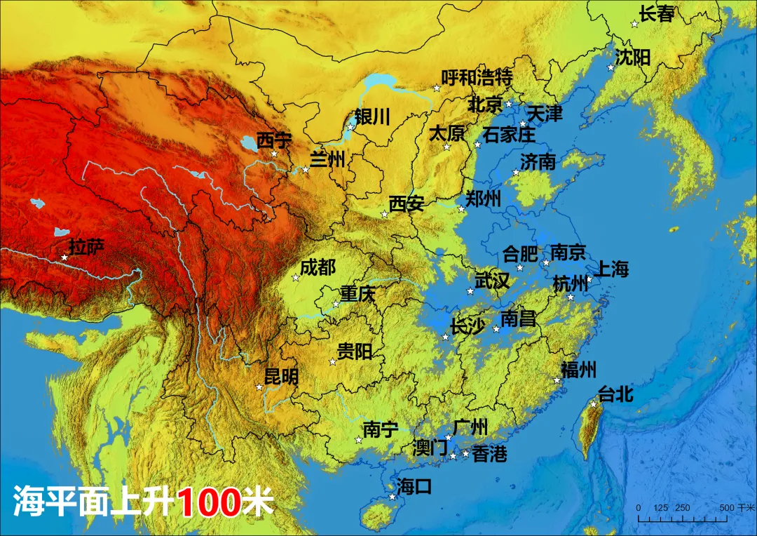 下面是一张海平面上升的动态效果图。当海平面上升 100 米的虚拟情景席卷华夏大地,这幅波澜壮阔的图景不仅是地理的重构,更是文明存续的深刻隐喻。从渤海湾到珠江口,从长三角到东北平原,我国东部广袤的精华之地将化为沧海,唯有西部高原与山地如岛屿般矗立。这既是对 “西高东低” 地势的极端演绎,更揭示了人类文明在自然伟力面前的脆弱与坚韧。