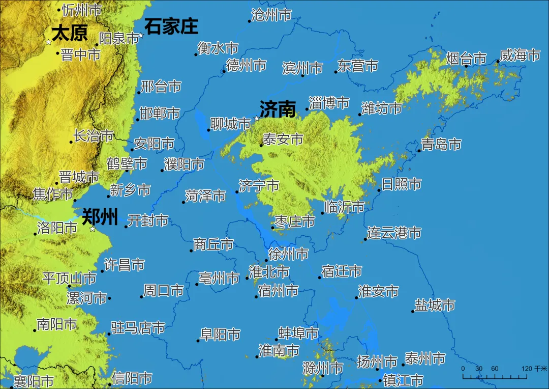 山东半岛区域:济南、淄博、潍坊、东营等城市会被淹没,仅泰山、鲁中南山地丘陵会成为孤立的 “岛屿”。青岛、烟台、威海等沿海城市会被完全淹没,山东半岛仅剩下中部的山地丘陵区域。