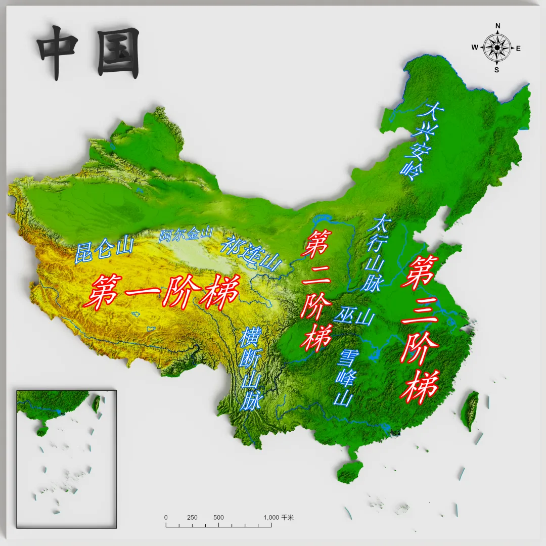 这是一张中国立体地形地貌图,可以看到“西高东低、呈三级阶梯状分布” 的地形特点。其中,第一、二级阶梯分界线为昆仑山 — 祁连山 — 横断山脉;第二、三级阶梯分界线为大兴安岭 — 太行山 — 巫山 — 雪峰山。