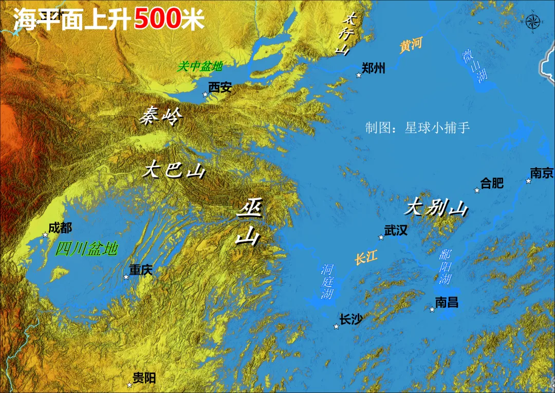 - 四川盆地:四川盆地被海水完全淹没,形成一个大型内陆湖,成都、重庆等城市均被淹没,仅盆地边缘的山地(如大巴山、巫山)成为半岛。