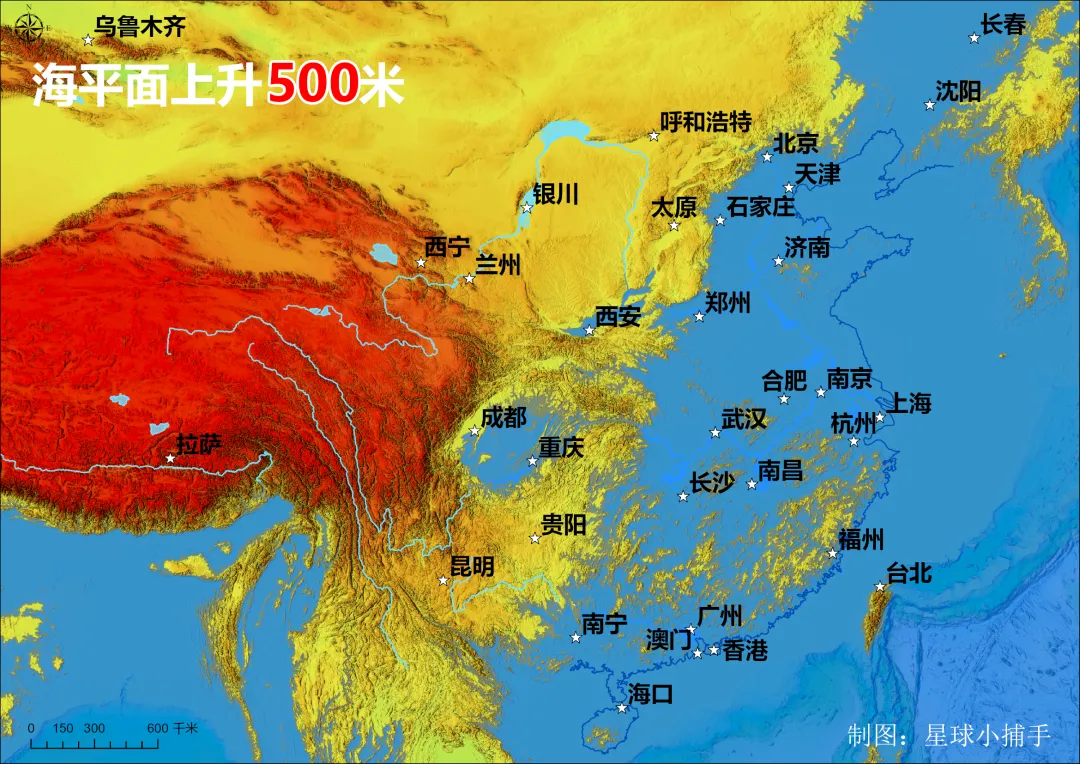 这张图是一张海平面上升 500 米后的中国及周边地区模拟地形图,直观展示了极端海平面上升对我国地理格局的影响: