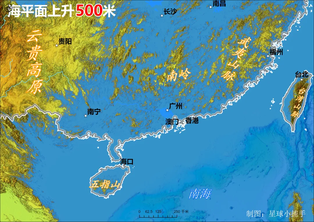 接下来,我将模拟海平面上升500米,观察其地形地貌特征。声明:全球冰盖融化,海平面上升66米左右,因此本次模拟仅供参考,仅用于反映地形地貌特征。