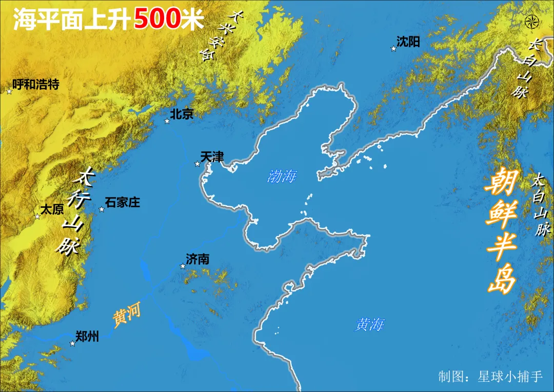 - 东北平原:整个东北平原(松嫩平原、辽河平原)被海水完全淹没,形成一片广阔的内陆海。主要城市如沈阳、长春被淹没,仅哈尔滨因地处松嫩平原北部,海拔相对较高,成为新的沿海城市。