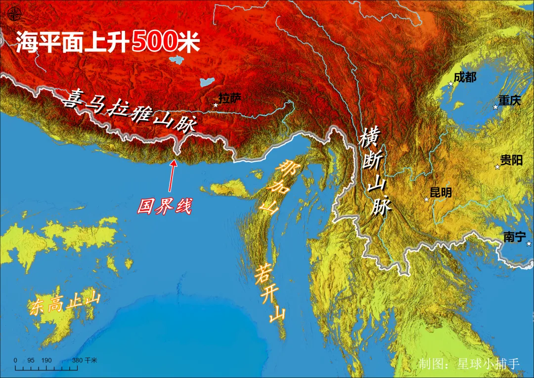青藏高原及周边:青藏高原平均海拔超过 4000 米,因此在海平面上升 500 米的模拟中,拉萨、贵阳、昆明等城市均未被淹没。
