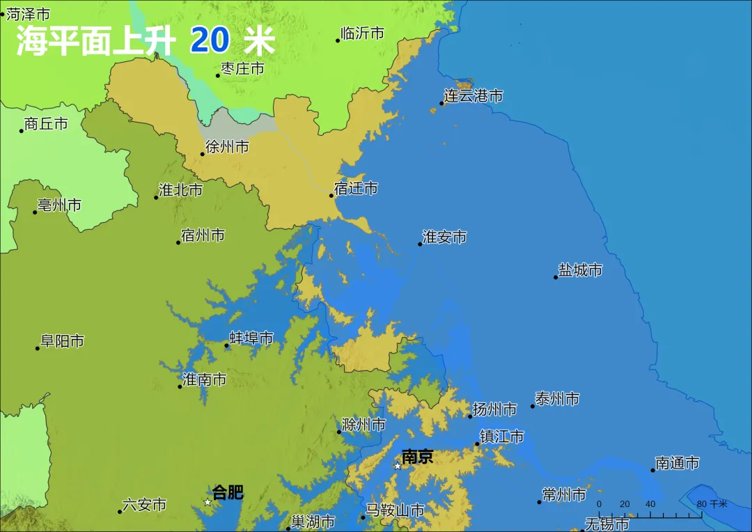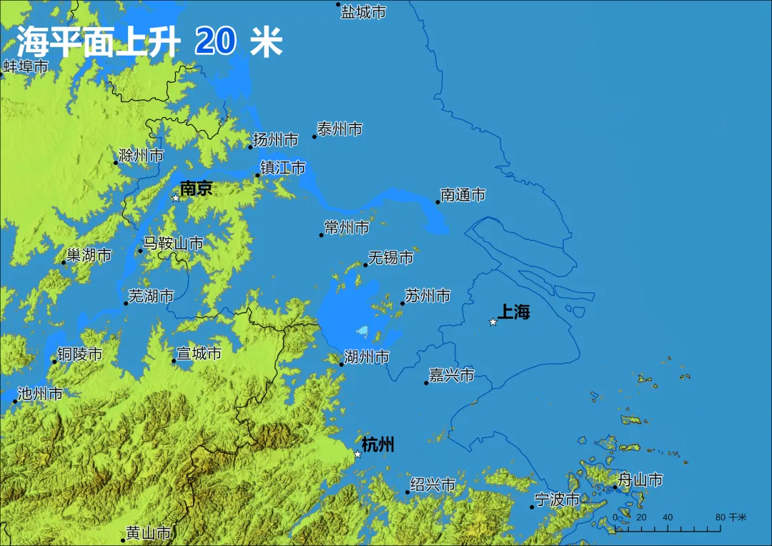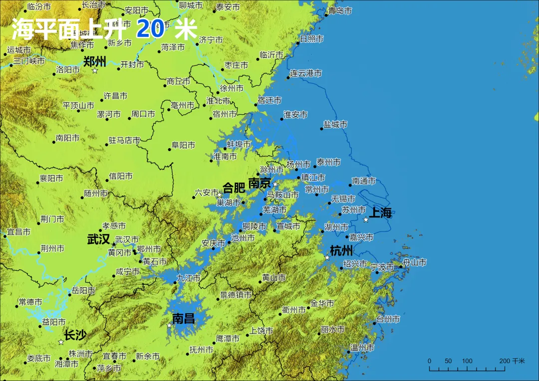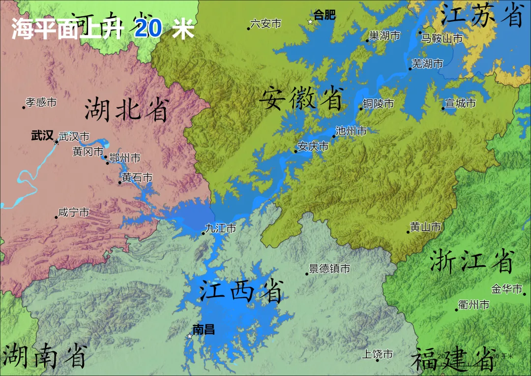 下面是 “海平面上升 20 米” 的长三角及江淮流域模拟图。长江下游平原被海水吞噬,海岸线向安徽、江西内陆退缩约 100-200 公里。