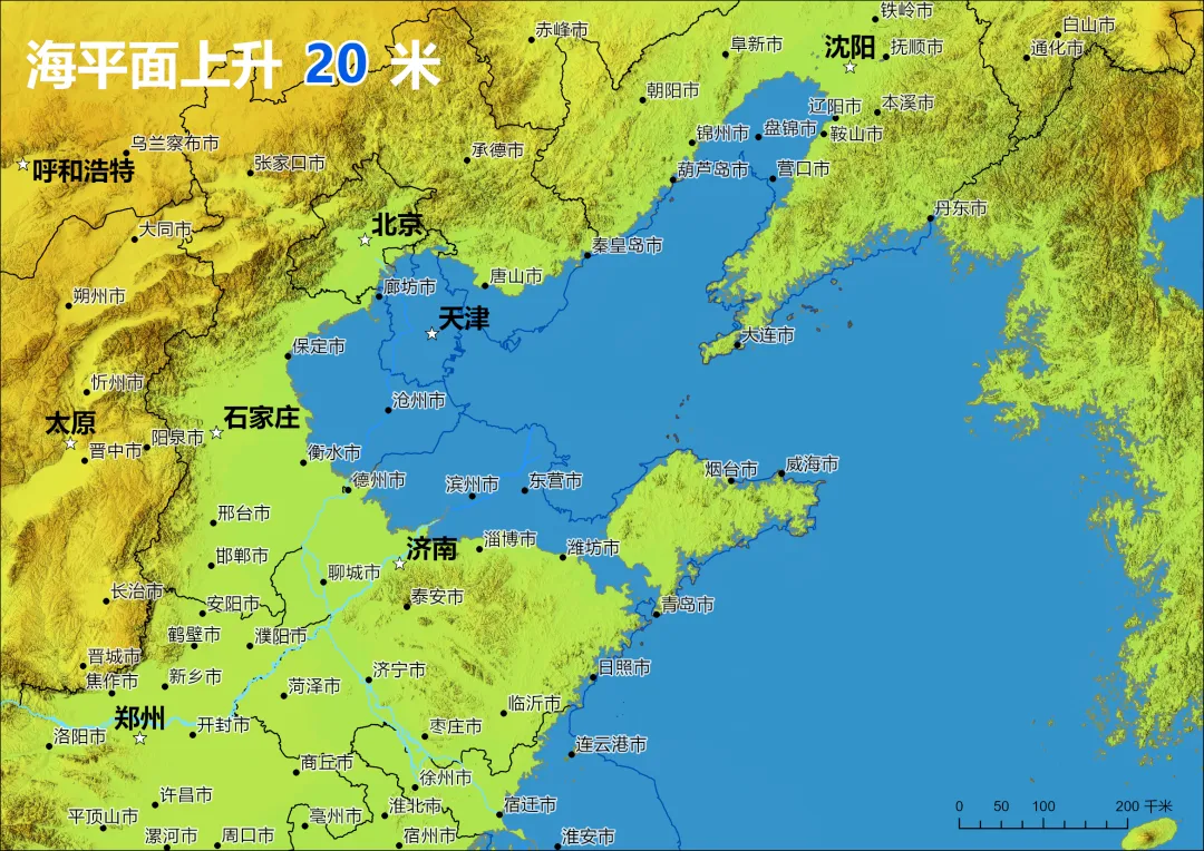 下面是 “海平面上升 20 米” 的环渤海及华北地区模拟图。渤海与黄海连通,华北平原东部、辽河平原南部被海水吞噬,海岸线向内陆退缩超 100 公里。