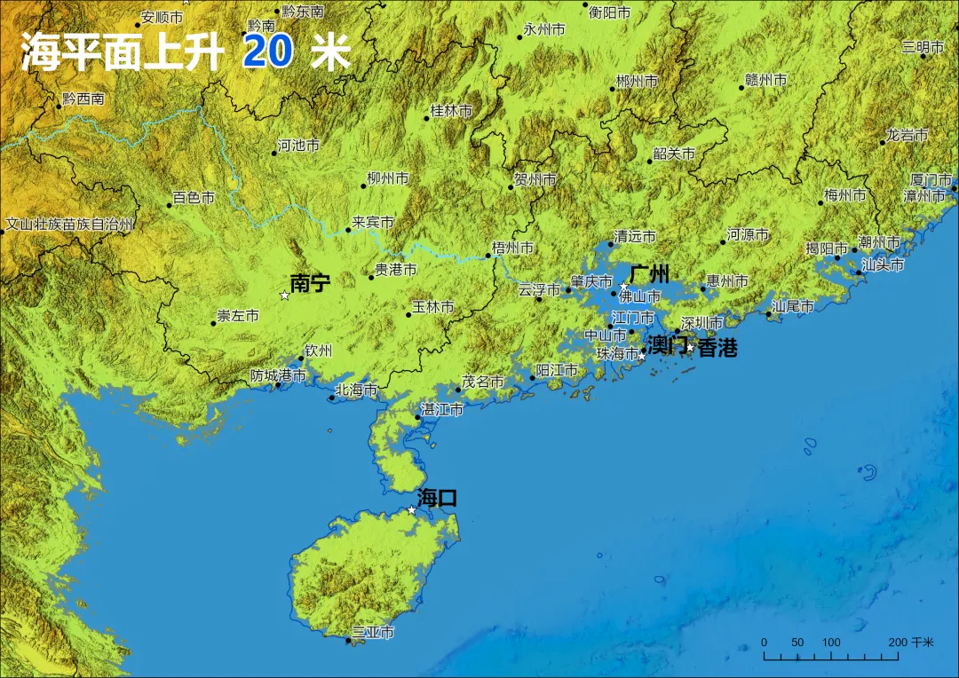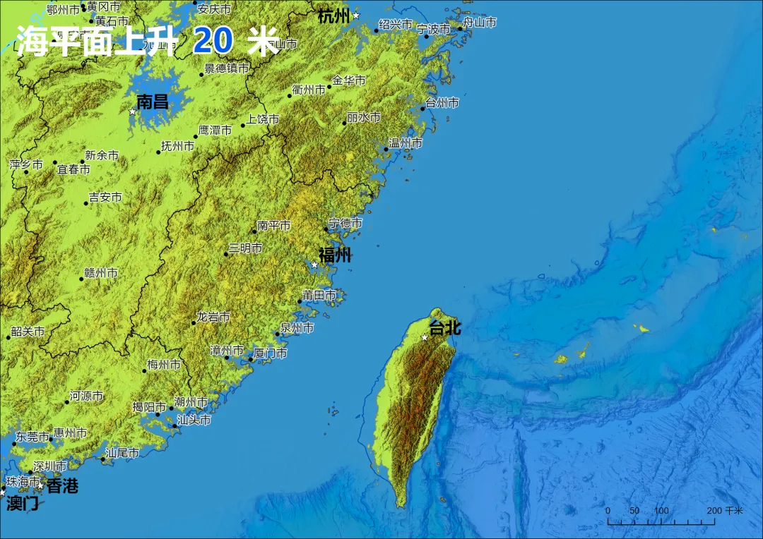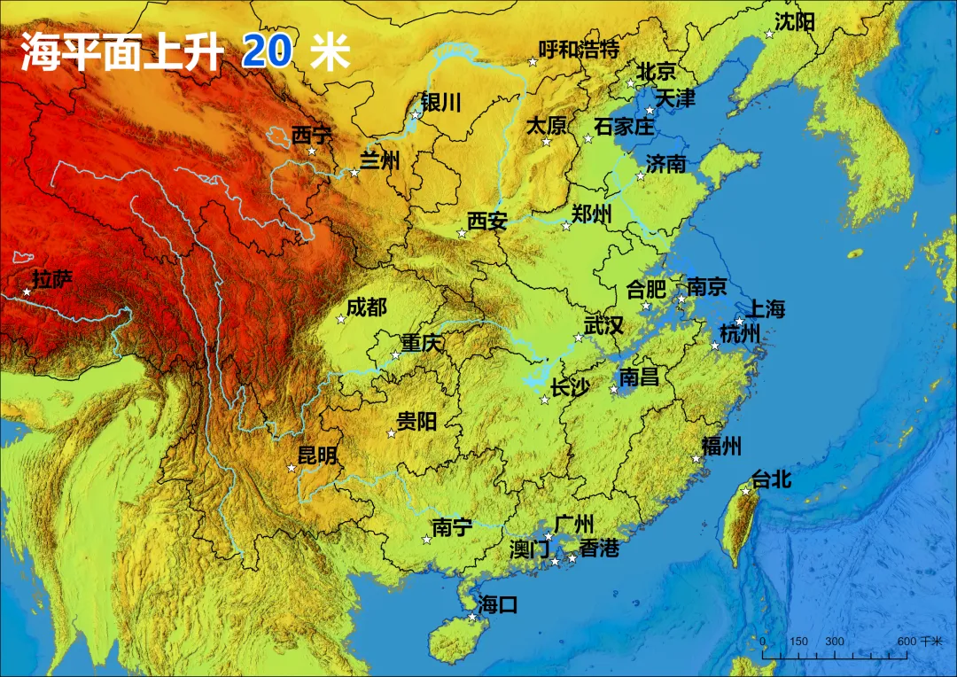 模拟海平面上升20米,中国的海岸线会变成什么样?