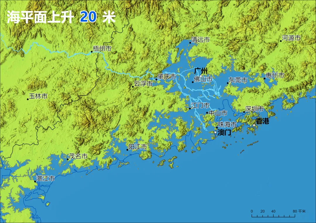 其中,整个珠江口冲积平原被海水彻底吞噬,珠江水系的入海口大幅向内陆退缩,形成巨型海湾(上图所示)。原本的珠三角城市群将仅剩下肇庆、清远等少数内陆城市,广州、深圳等核心城市的功能需向粤北、粤西迁移。